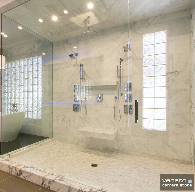 Rebecca lehde, inspiro 8 studios our first example is a classic master bathroom with floor and wall marble tile, by rebecca lehde via houzz. In the past two years i have had about 6 tile experts over to give me their opinion. Stunning carrara marble shower with marble subway tile shower surround and wall of polished nickel chrome shower jets. We did a polished carrara basketweave floor and as an accent on the shower walls, and honed slab carrara for the vanity top and tub deck. Tub transfer bench and sliding shower chair made of heavy duty non slip aluminum body and seat with adjustable seat height and cut out access holding weight capacity up to 400 lbs, gray.